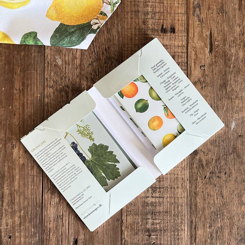 Con su precisión y línea precisa, Kirsten Tind ha dibujado una gran cantidad de flores y plantas maravillosas y para esta carpeta de mapas, ha creado ocho hermosos frutos, todos los cuales son muy adecuados para un invernadero.