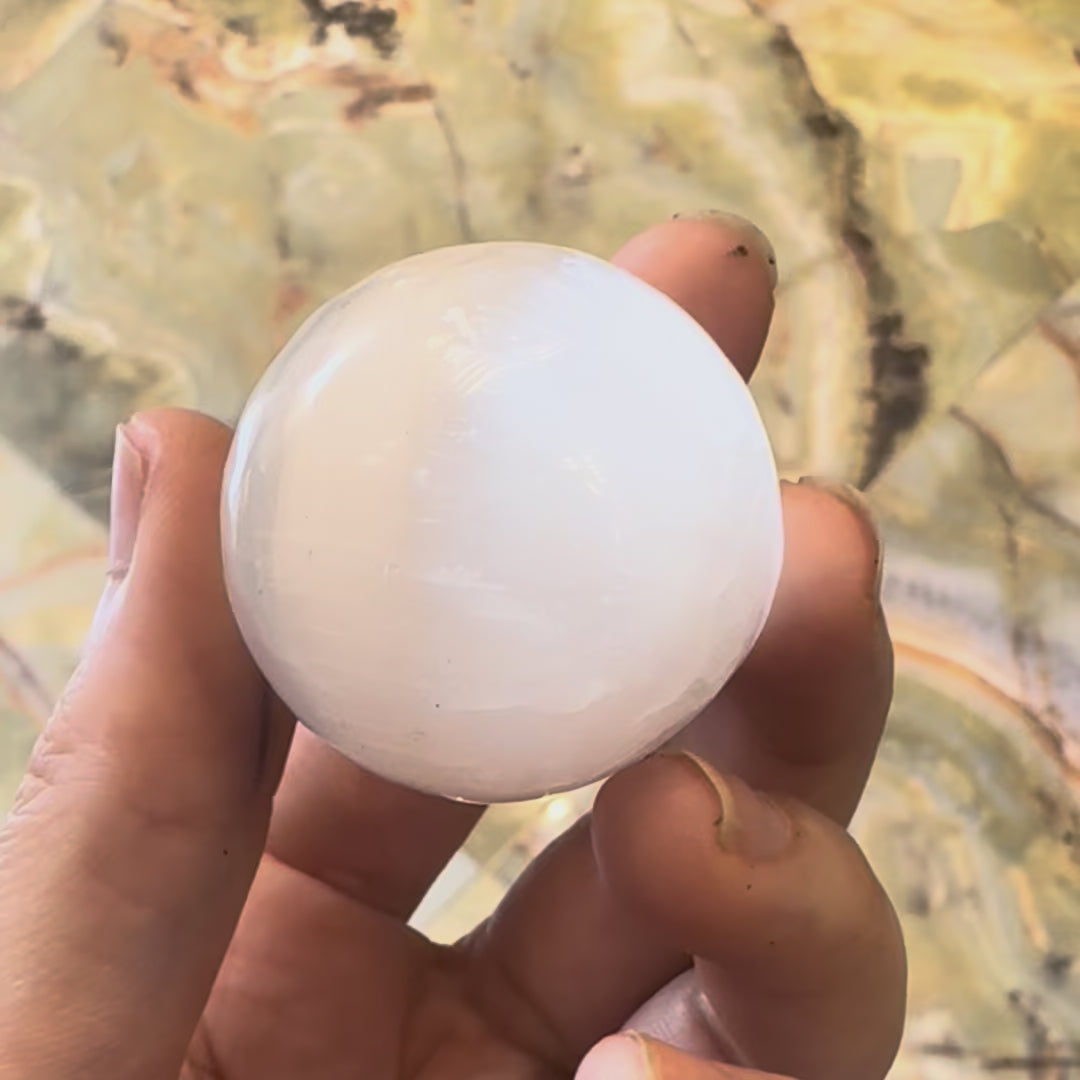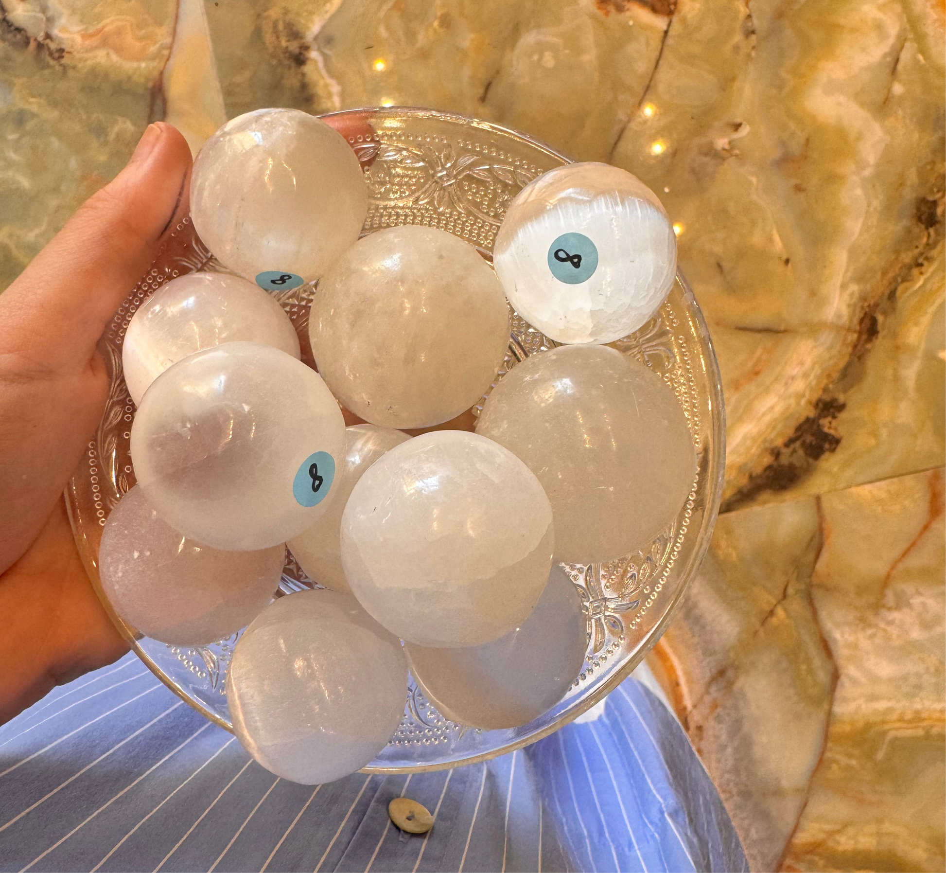 Colocar una esfera de selenita en tu altar, en tu sala o en tu mesita de noche es ofrecerte un recordatorio constante: la luz habita en ti, serena y eterna, como la luna en su ciclo infinito.
