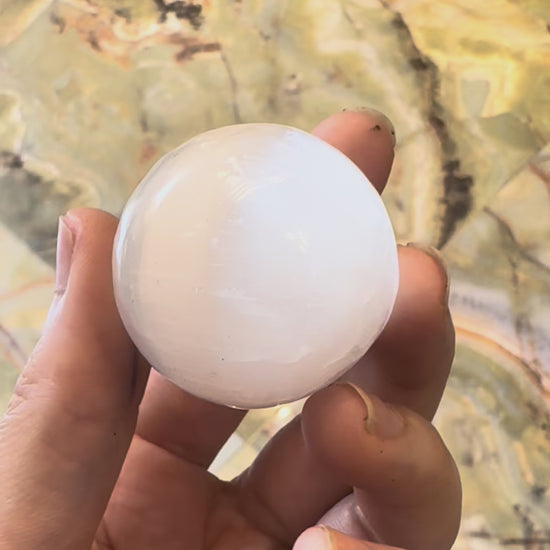 La selenita debe su nombre a Selene, diosa griega de la Luna, aquella que recorría el cielo nocturno en su carro de plata iluminando la oscuridad con su resplandor sereno. Cada esfera de este mineral parece contener un pedazo de esa luz, como si llevara en su interior un amanecer perpetuo.