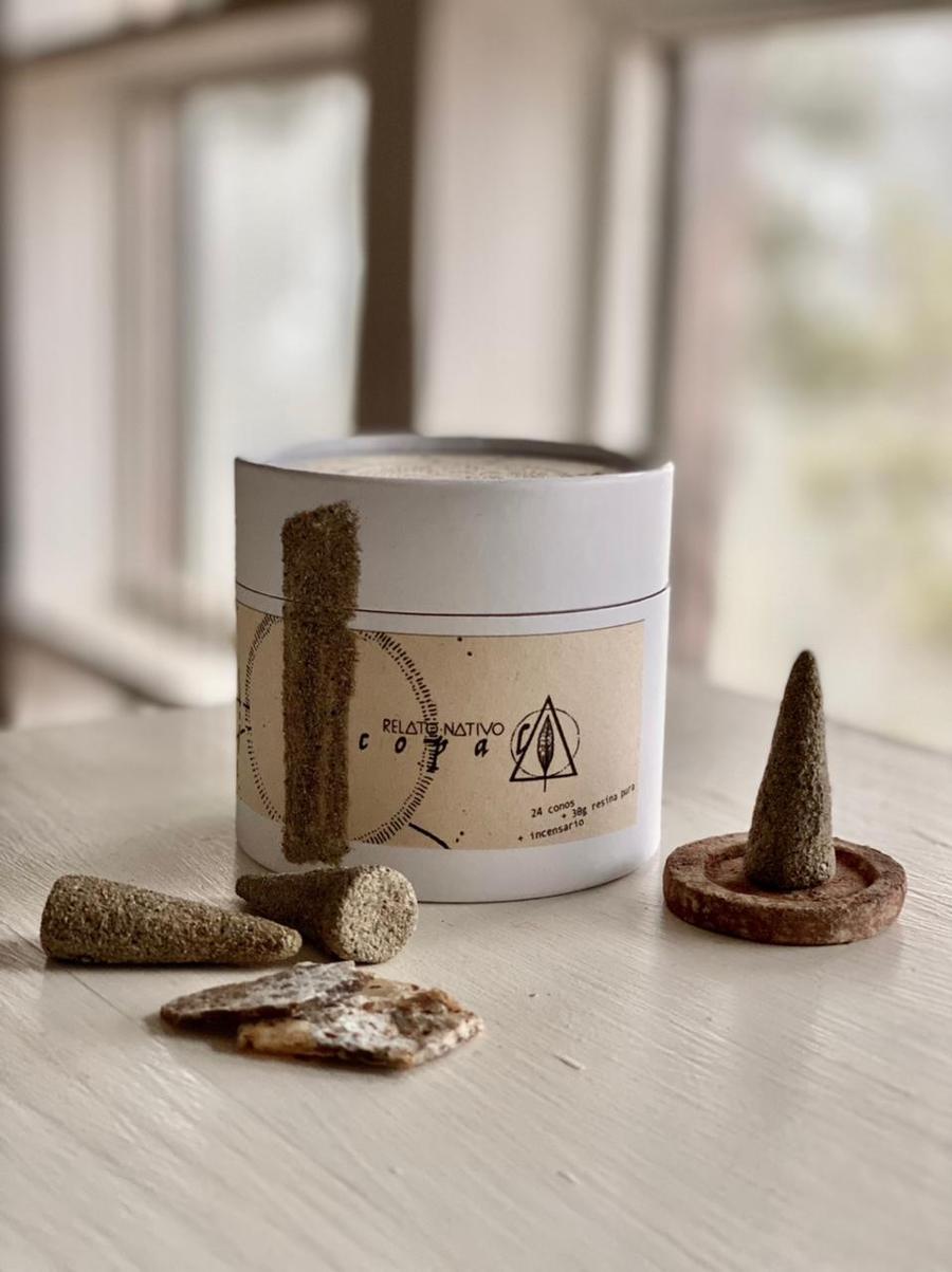Modo de uso: enciende la punta del cono, sopla suavemente para apagar la llama y formar una brasa uniforme en la punta, coloca en una superficie segura sobre un incensario.