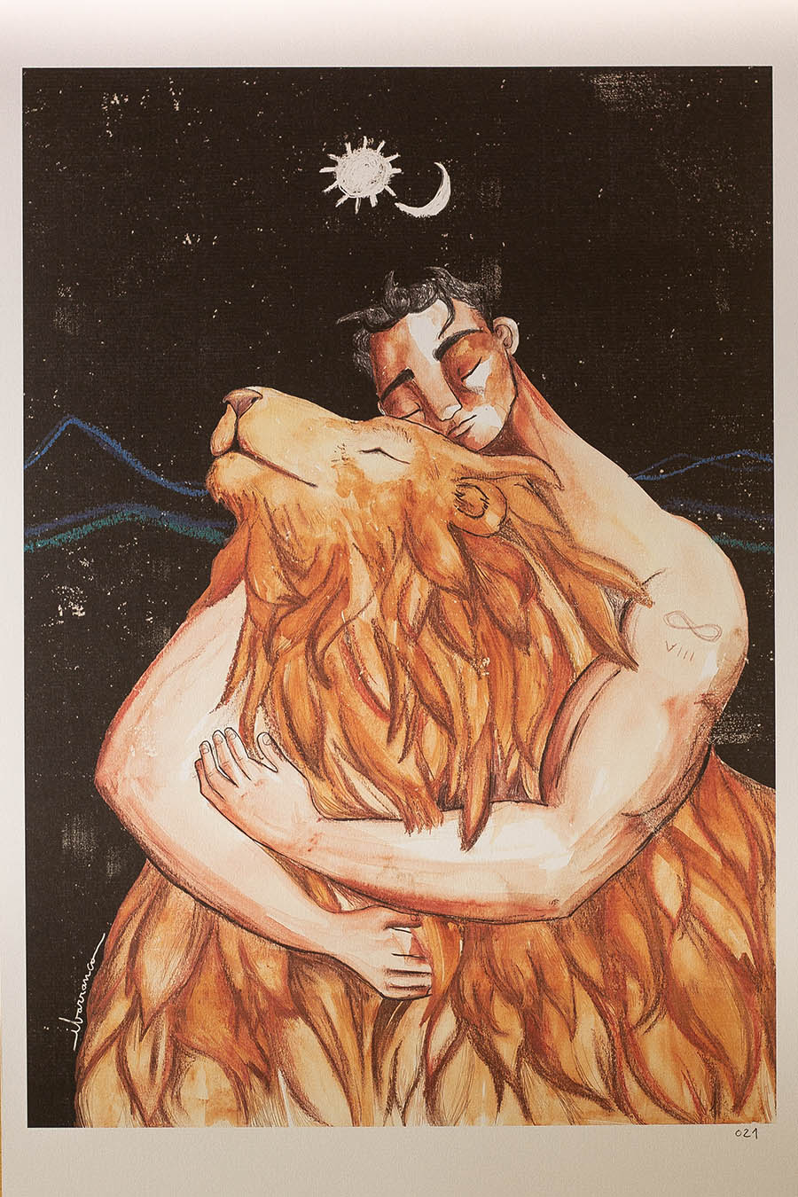 Resignificación del Tarot desde una perspectiva humanista. El verdadero poder no es la lucha, sino la aceptación humilde y desde el amor de aquello que es. De aquello que somos. El león simboliza el poder interior. Es amarillo, como el chakra del plexo solar. Hombre y fiera se reconcilian en en un abrazo, poniendo fin a la lucha arquetípica que encarnó Hércules con el león de Nemea, condenando a la masculinidad a sostener su fuerza desde la brutalidad y no desde el reconocimiento.