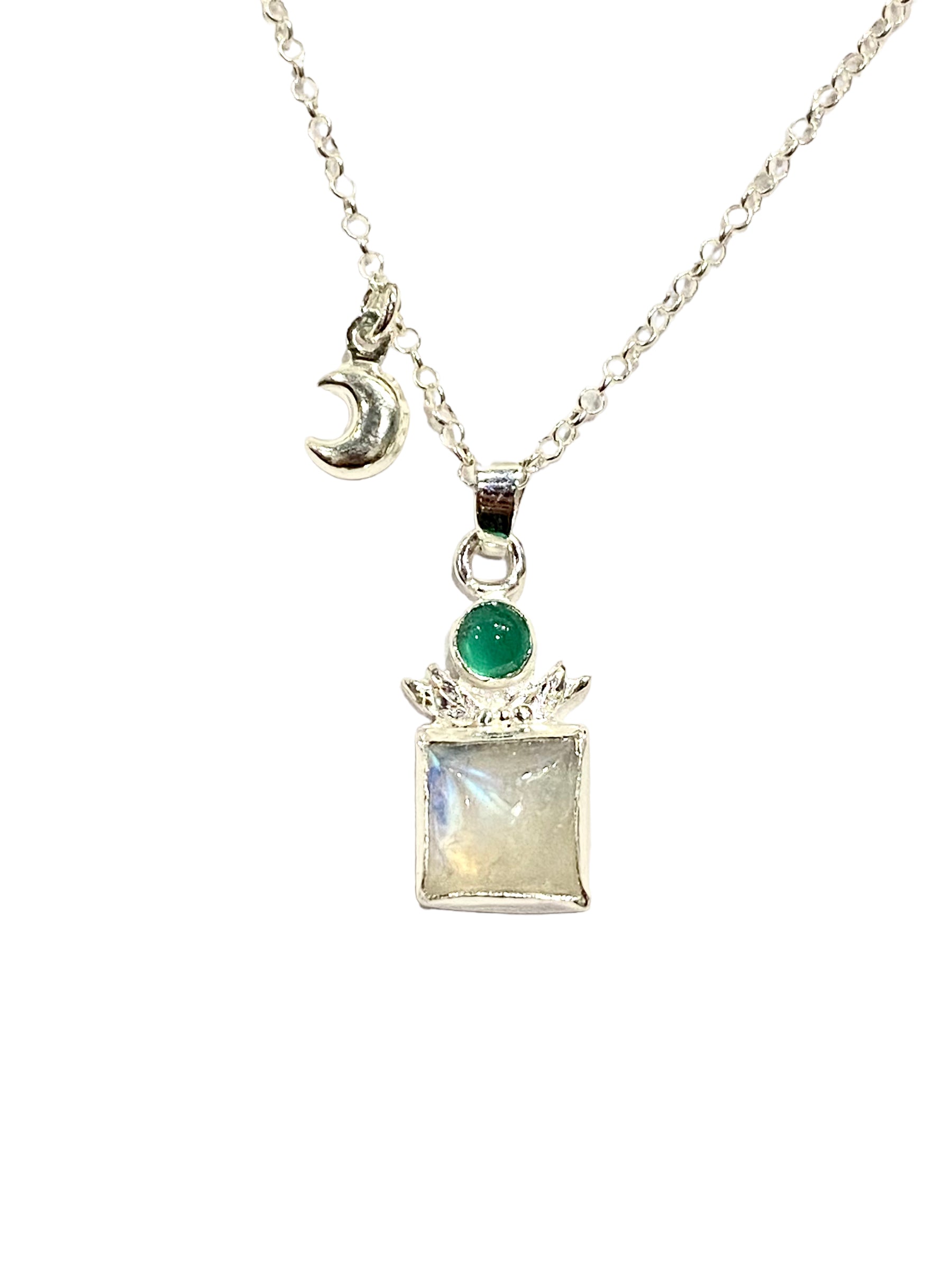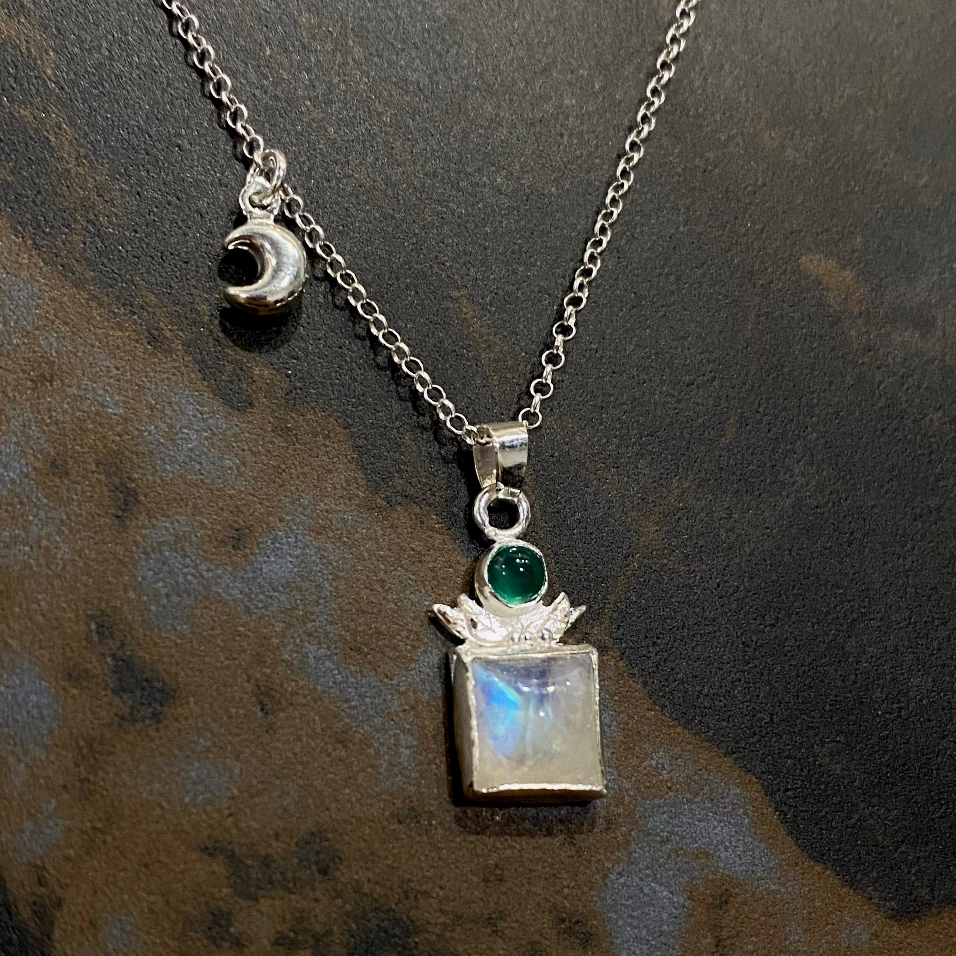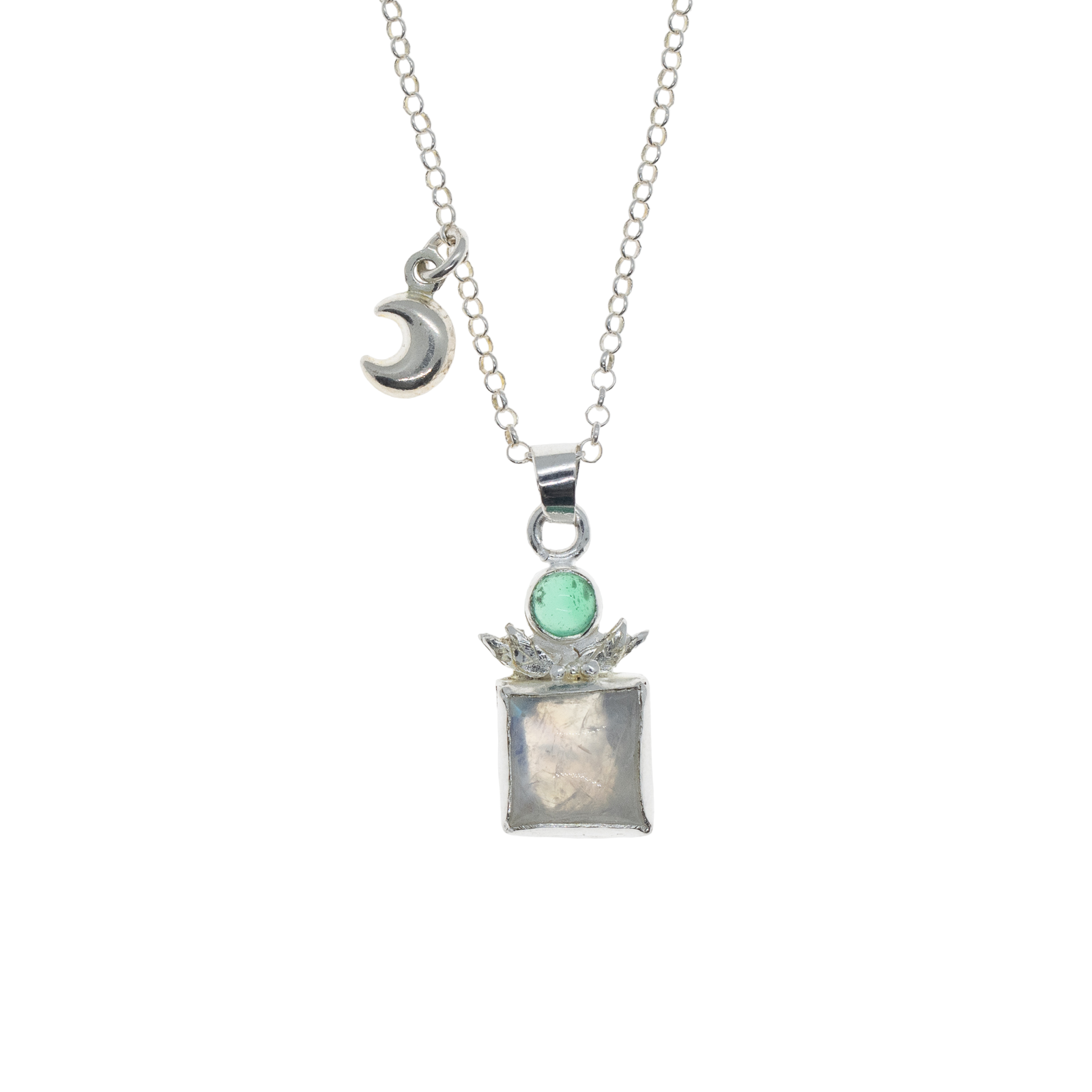 Y una Piedra luna, con forma cuadrada, que está coronada por tres bolitas de plata. Las bolas de plata son un recurso muy característico en la joyería de estilo indio. El número 3 representa la búsqueda espiritual y la incorporación de la fe.