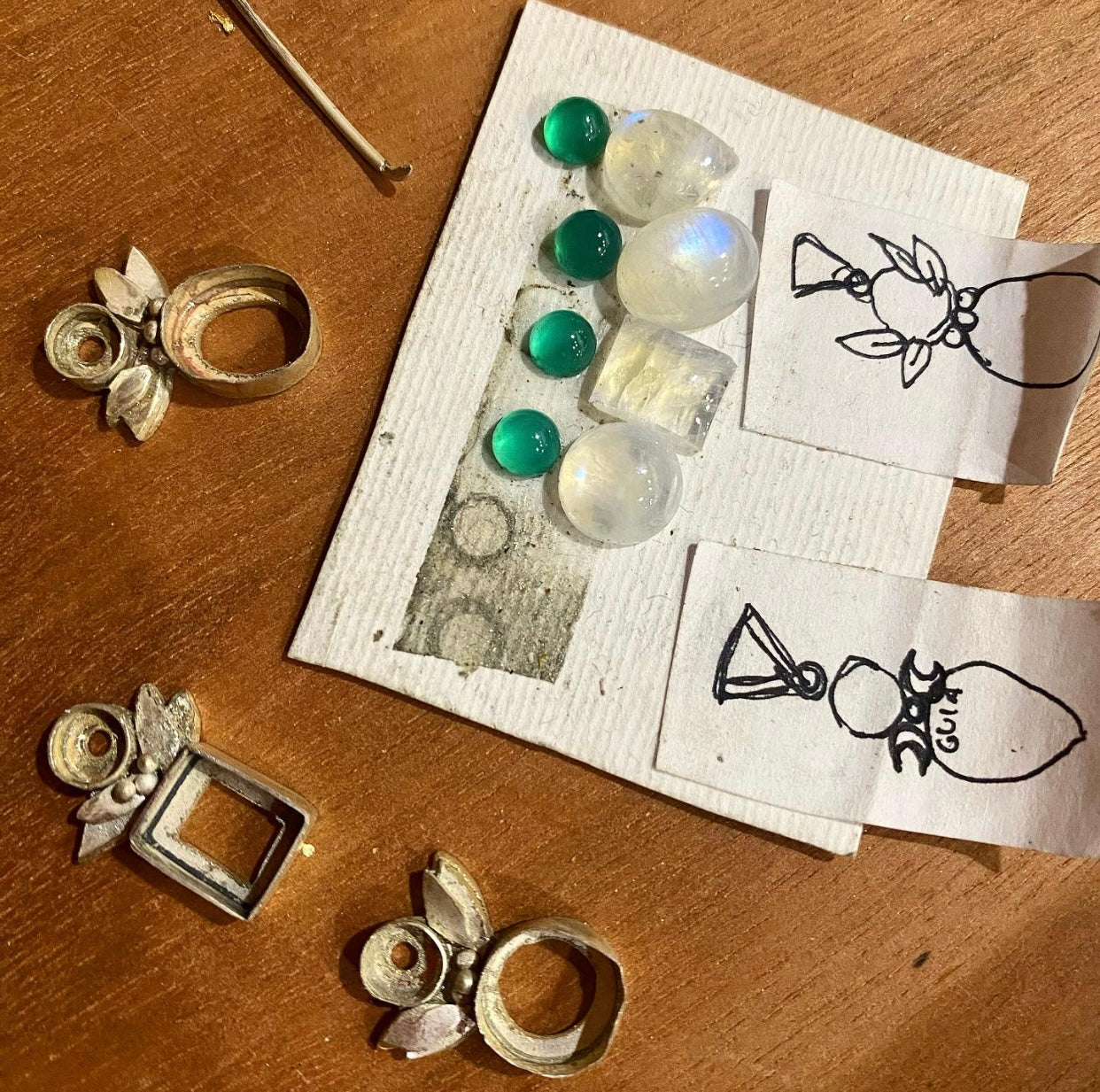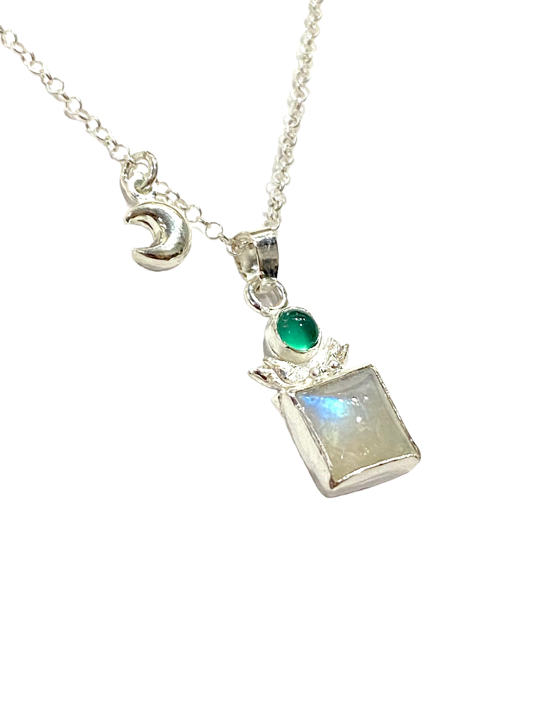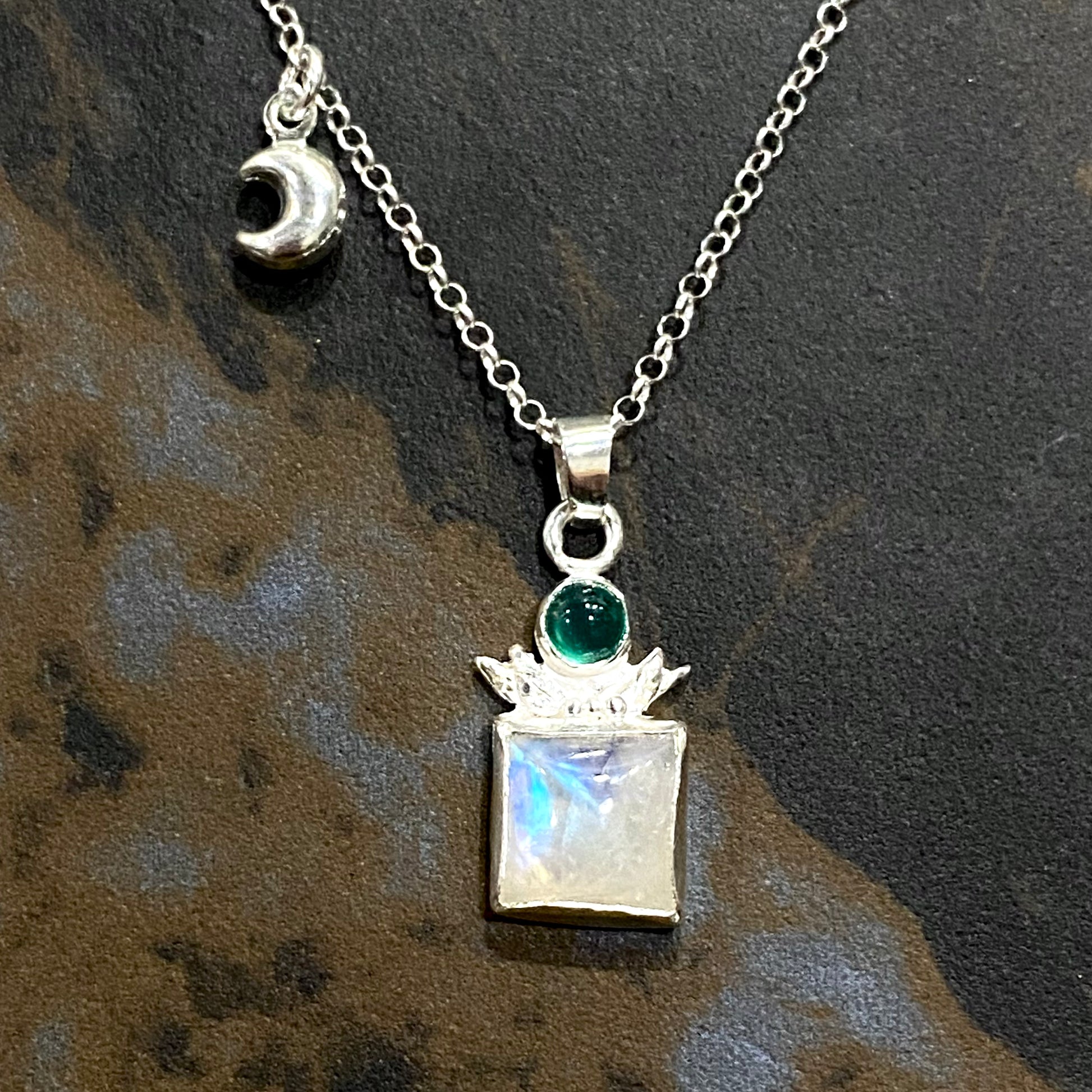 Y una Piedra luna, con forma cuadrada, que está coronada por tres bolitas de plata. Las bolas de plata son un recurso muy característico en la joyería de estilo indio. El número 3 representa la búsqueda espiritual y la incorporación de la fe.