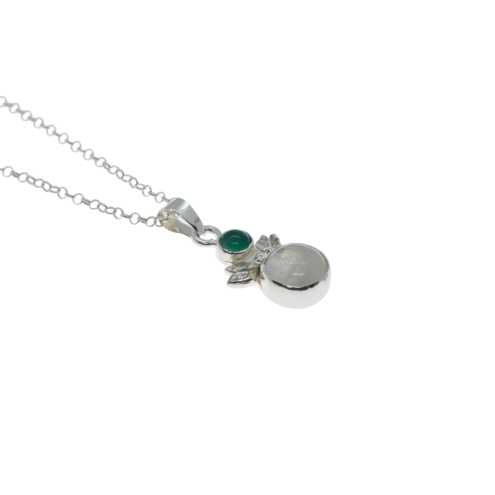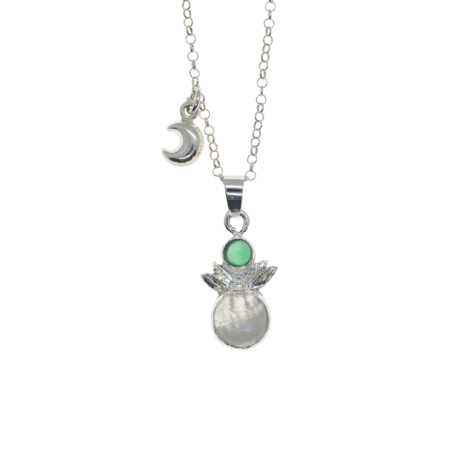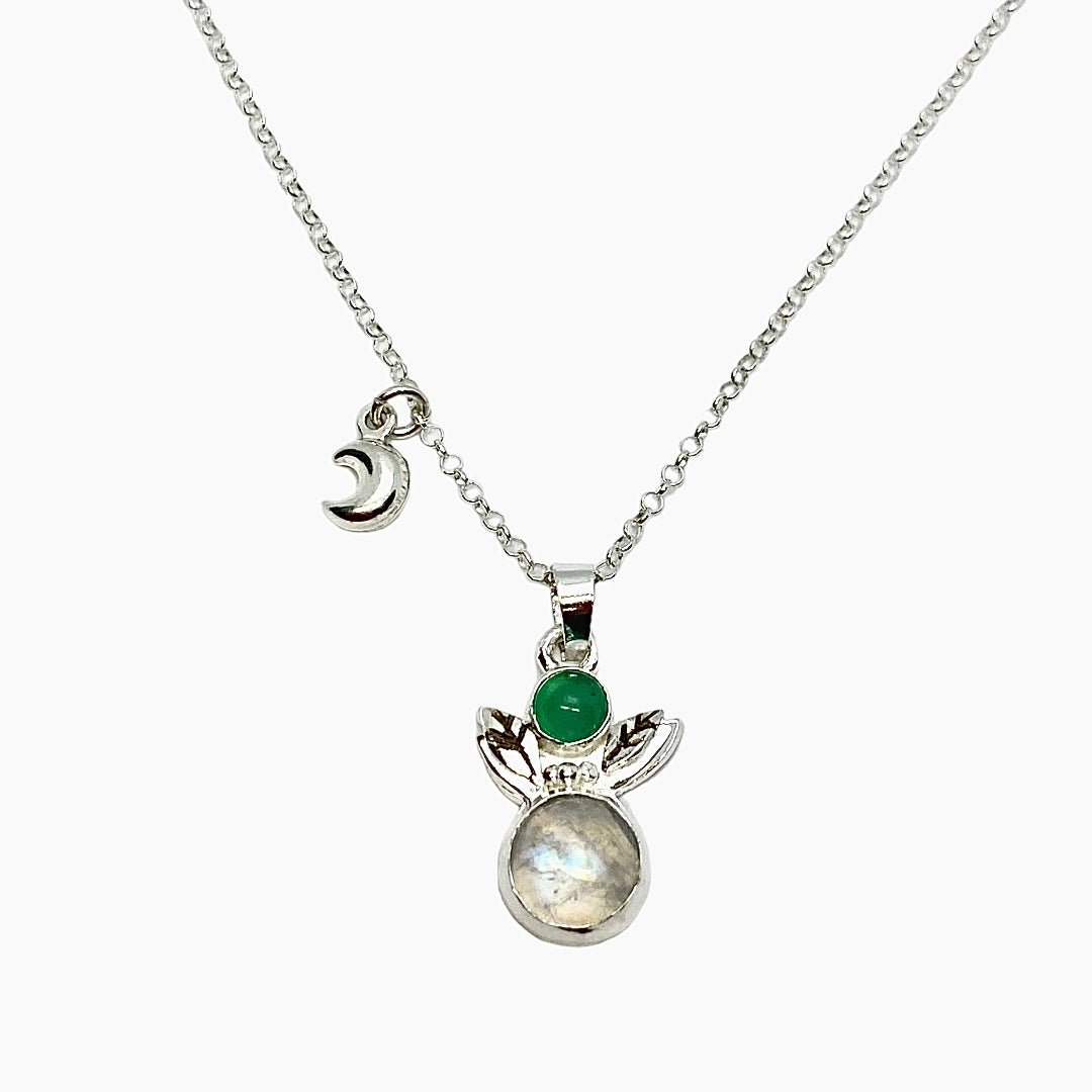 Y una Piedra luna, con forma redonda, que está coronada por tres bolitas de plata. Las bolas de plata son un recurso muy característico en la joyería de estilo indio. El número 3 representa la búsqueda espiritual y la incorporación de la fe.